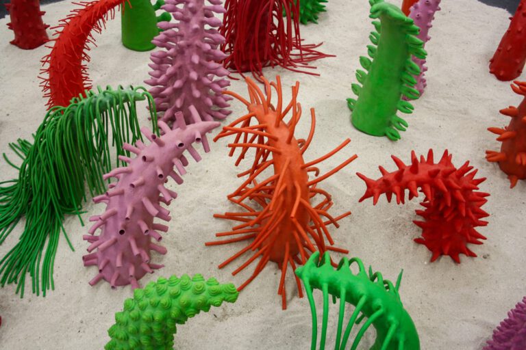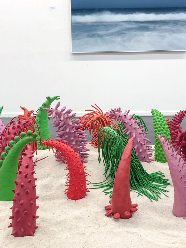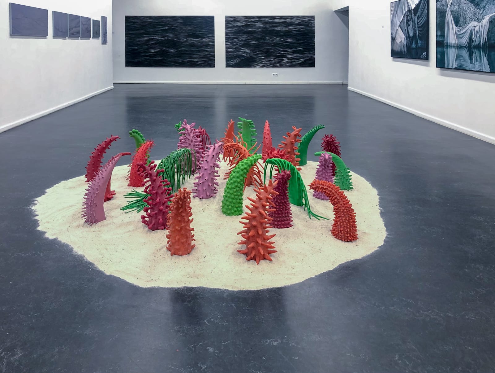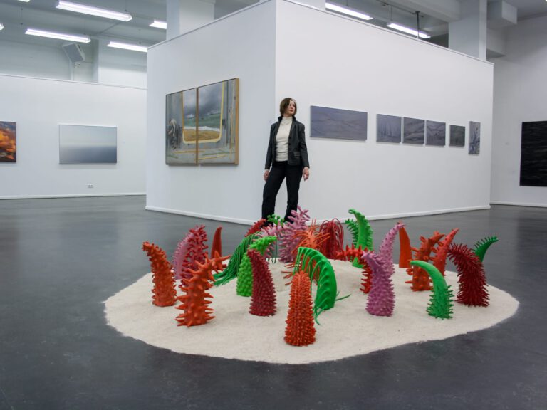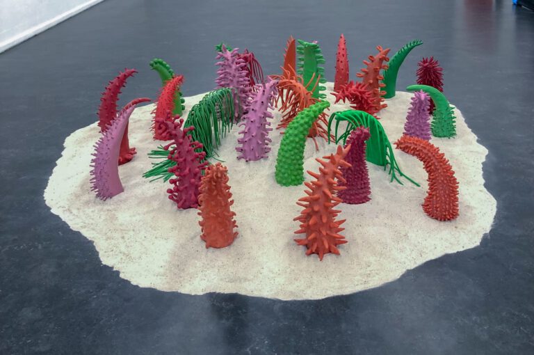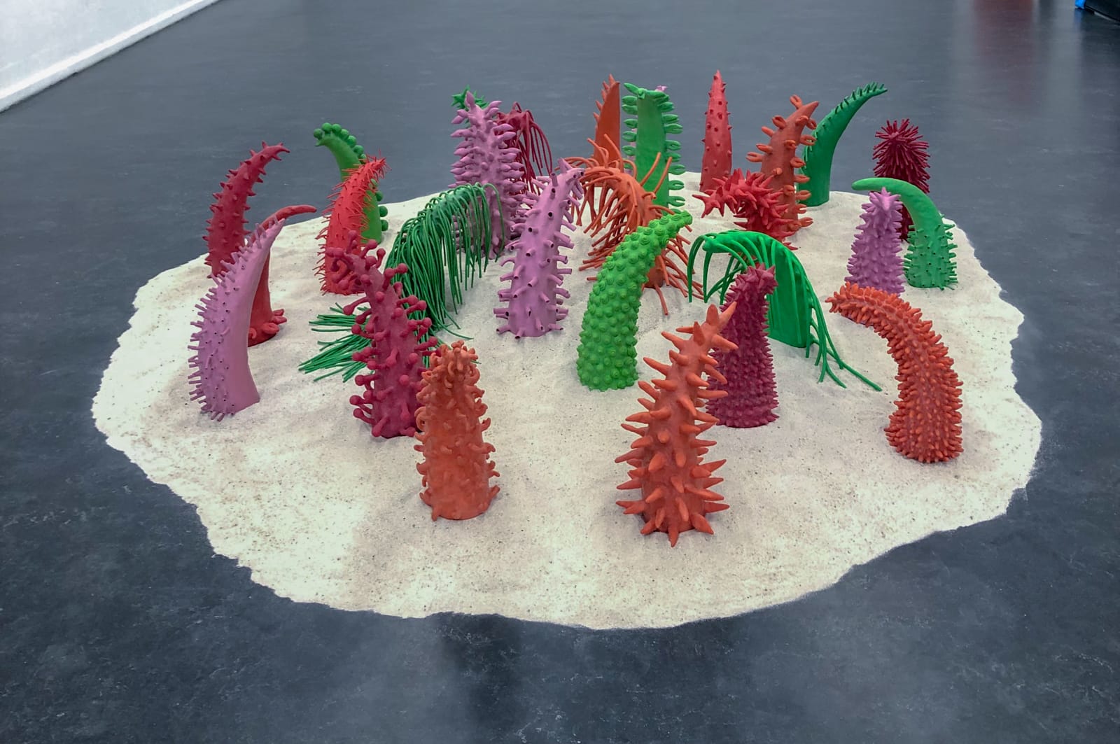 Eine grellgrüne Fläche oder metallene Tischplatte bilden den Grund, aus dem knallbunte, zottelige Hörner zu wachsen scheinen. Witzig, skurril, fremdartig und doch vertraut. Füllig, sinnlich, schön.
